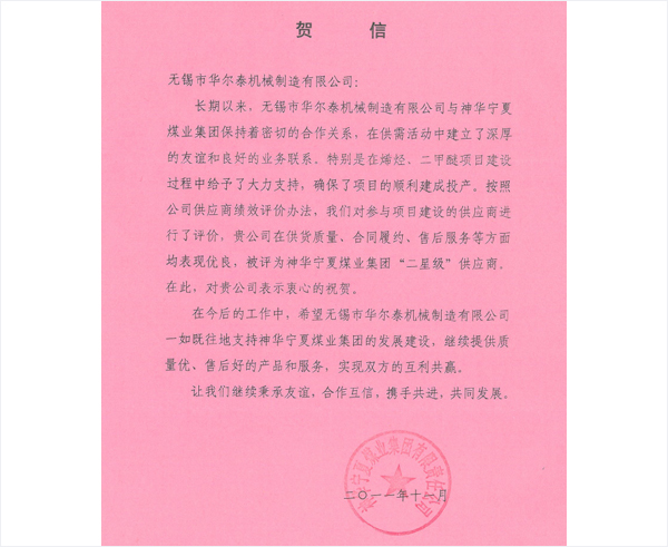 宁煤二星级供应商贺信